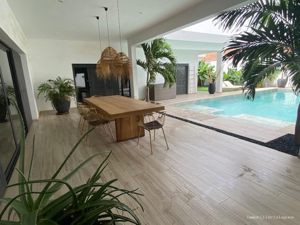 Villa à vendre à Nguerigne. Somptueuse propriété de 400m2 habitables implantée sur un beau terrain arboré de 1957m2, alliant élégance, modernité et autonomie énergétique (100% autonome). Conçue avec des matériaux haut de gamme, entièrement meublée, décorée avec goût et raffinée, elle offre des belles prestations dans un cadre de vie exceptionnel. Elle bénéficie d'un vaste séjour lumineux, une cuisine aménagée et équipée, 5 chambres avec salles d'eau respectives (dont 1 suite parentale de 60m2 avec baignoire, douche et dressing et 2 bungalows indépendants de 45m2), des espaces de vie extérieurs aménagés avec soin, idéal pour la détente et des réceptions, une piscine solaire 12X5. Volets roulants, caméras de surveillance, abris voiture et parking, portail et clôture électrique, chambre de personnel. A seulement 3km des plages et 600m de la route principale. 400 m² habitables sur 1957 m² de terrain.