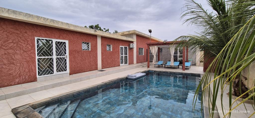 Villa à vendre à Somone. A 200m de la mer et 100m de la route et des commerces, charmante villa cosy de 150m2 (hors terrasse) implantée sur un beau terrain de 600m2 arboré de manguiers. Elle offre un beau séjour, salon TV, une cuisine américaine et 4 chambres avec salle d'eau respective. Belle terrasse face à sa piscine. Parking voiture, chambre de gardien. Quartier calme. 150 m² habitables sur 610 m² de terrain.